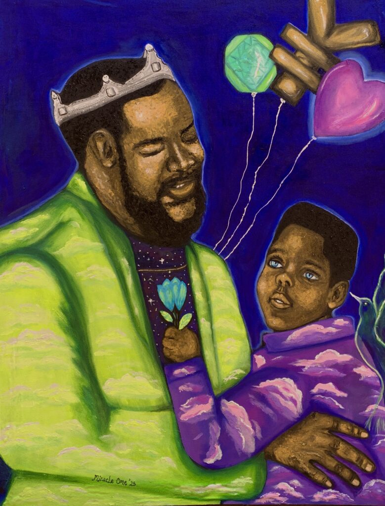 This piece depicts a tender moment of paternal affection, conveying a sense of safety, wisdom, and unconditional devotion.