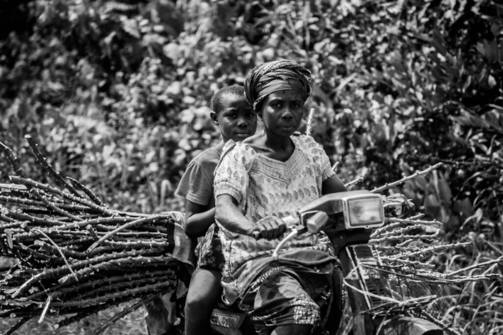A mother and her daughter leaving the farm on a motor bike carrying cassava sticks. Abia State, Nigeria,2021.