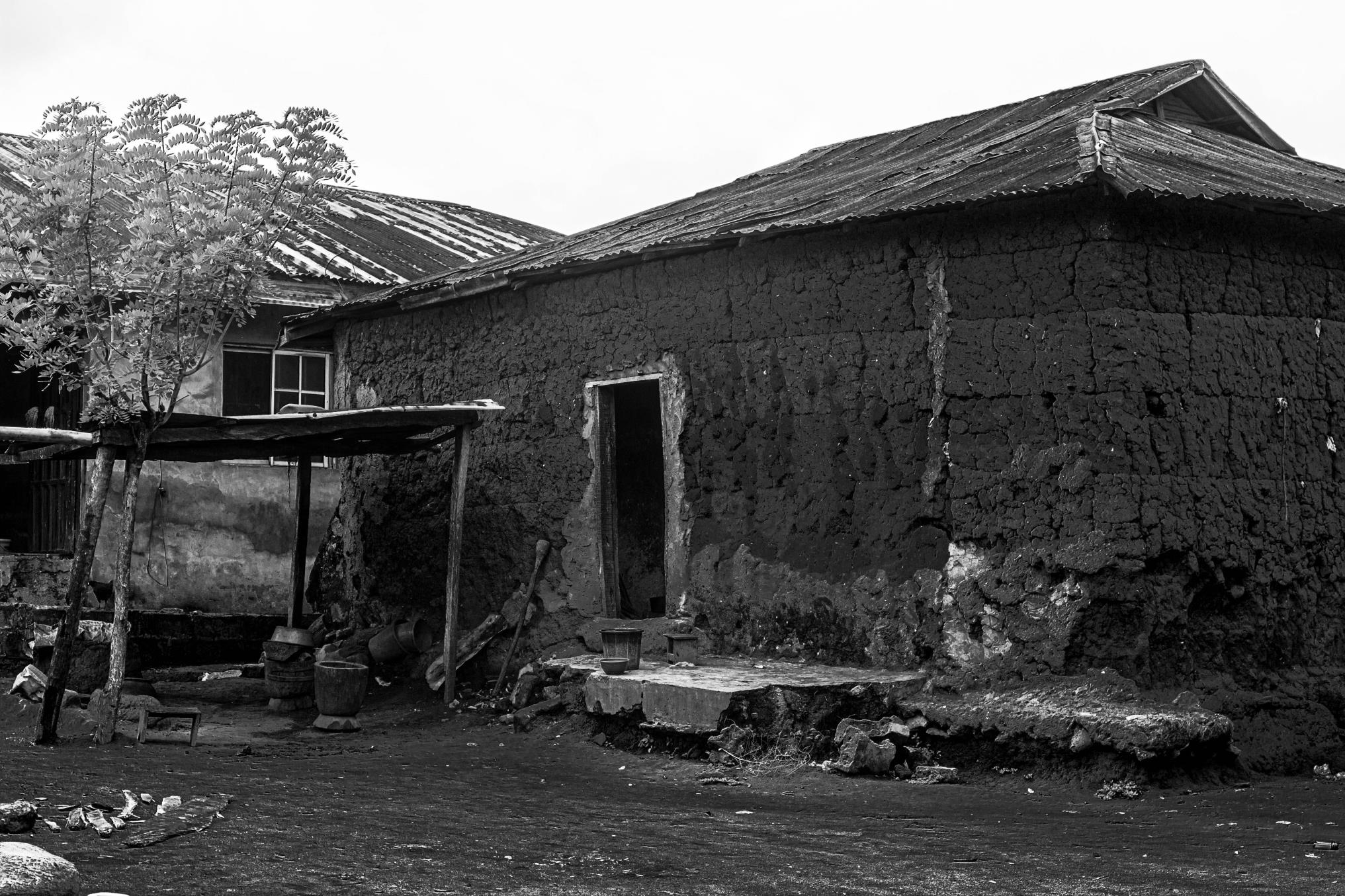 A back view of an old collapsing mud house where a kitchen stands. Ekiti State, Nigeria 2025.